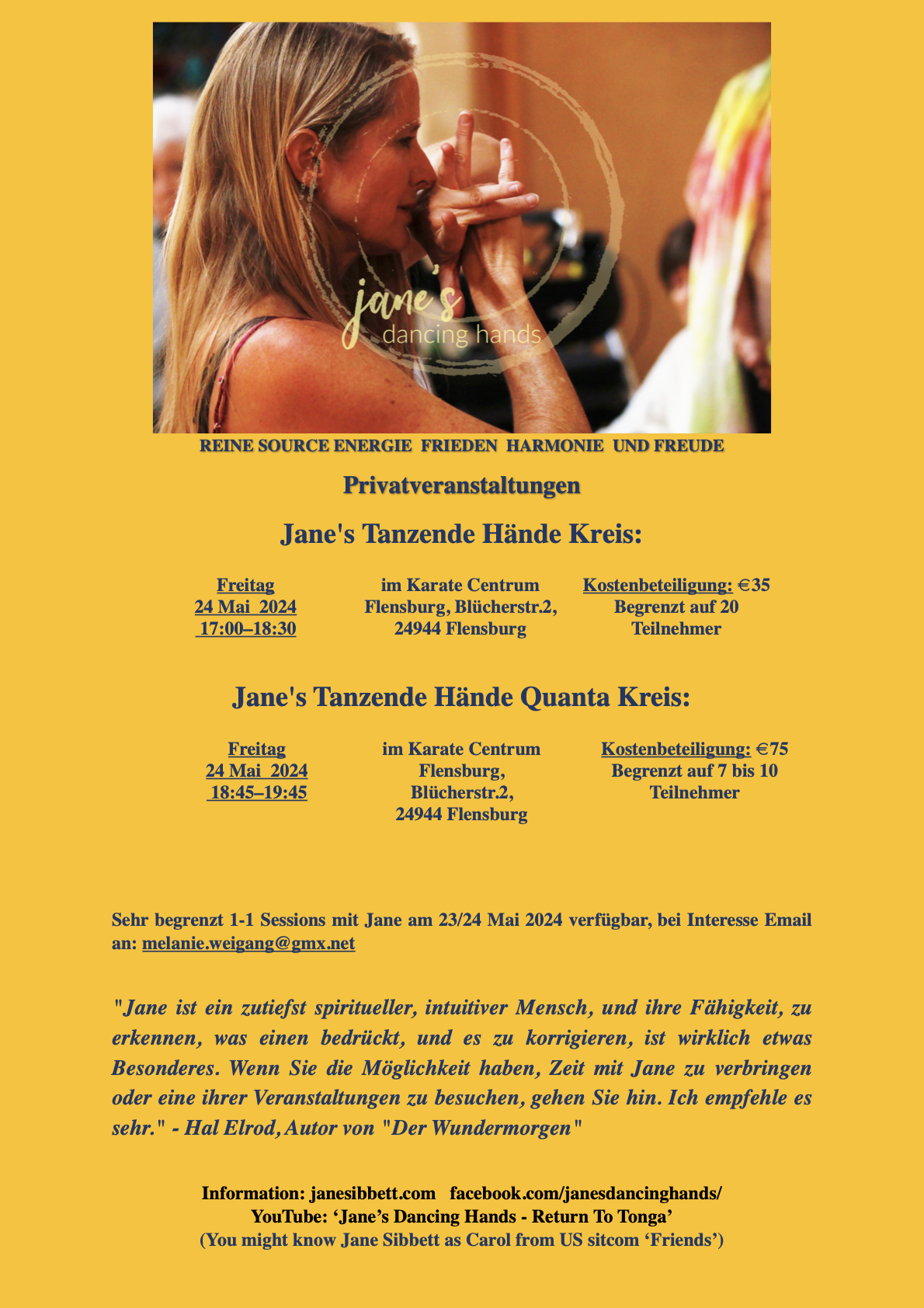 We are absolutely delighted to be opening our hearts in the idyllic, northern seaside town of Flensburg to dance in Germany for the first time! A wonderful attorney feeling the sacred tap of this gift spontaneously joined us on our retreat in Inverness, Scotland, over four years ago and invited Jane to come dance again when she was closer. When our friend moved back to Germany and the shifting world began revealing new opportunities, Jane hopped on a plane to dance this week here near the border of Denmark where the pace is sweet with salty winds of change. Here, we will have a traditional Jane’s Dancing Hands Circle, a Quanta Circle, and if time works out, a few opportunities for in-person private sessions not far from the Baltic Sea.