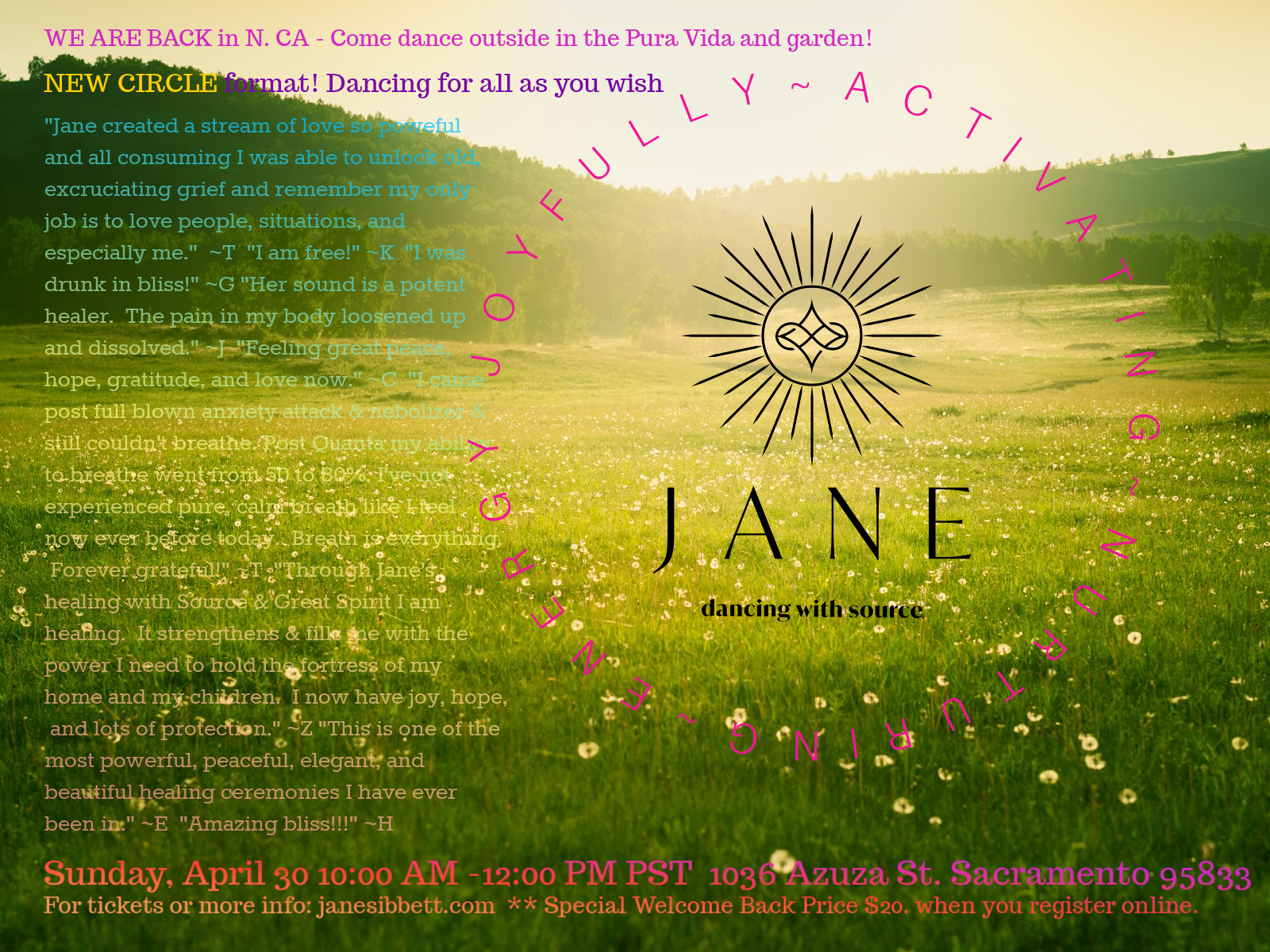 Understanding that many are still in transition from a protective and locked down world, if individuals feel comfortable, they may explore community while receiving the energy flowing through Jane in the beautiful garden space of our host in Sacramento.