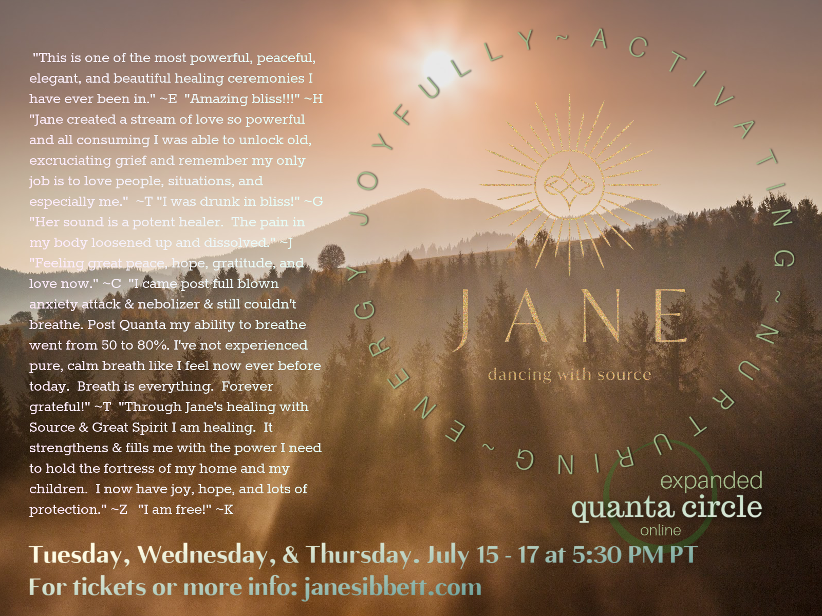 JANE’s Dancing Hands Expanded Quanta Circle – is an online version of Jane’s Quanta Circle. This format invites the same depth of work with the purest Source Energy in a transformational three-day arc of love, light, and abundant joy but within a more intimate group of between five and 14 people.