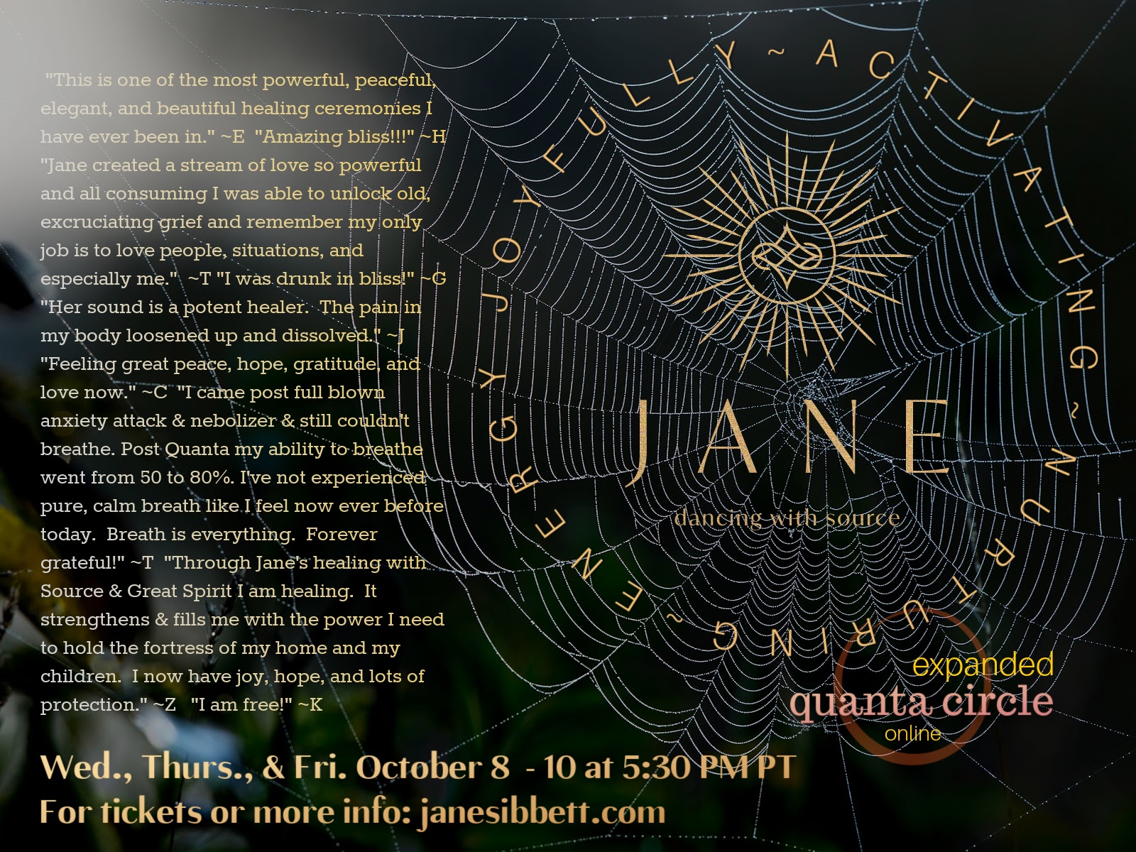 JANE’s Dancing Hands Expanded Quanta Circle – is an online version of Jane’s Quanta Circle. This format invites the same depth of work with the purest Source Energy in a transformational three-day arc of love, light, and abundant joy but within a more intimate group of between five and 14 people.